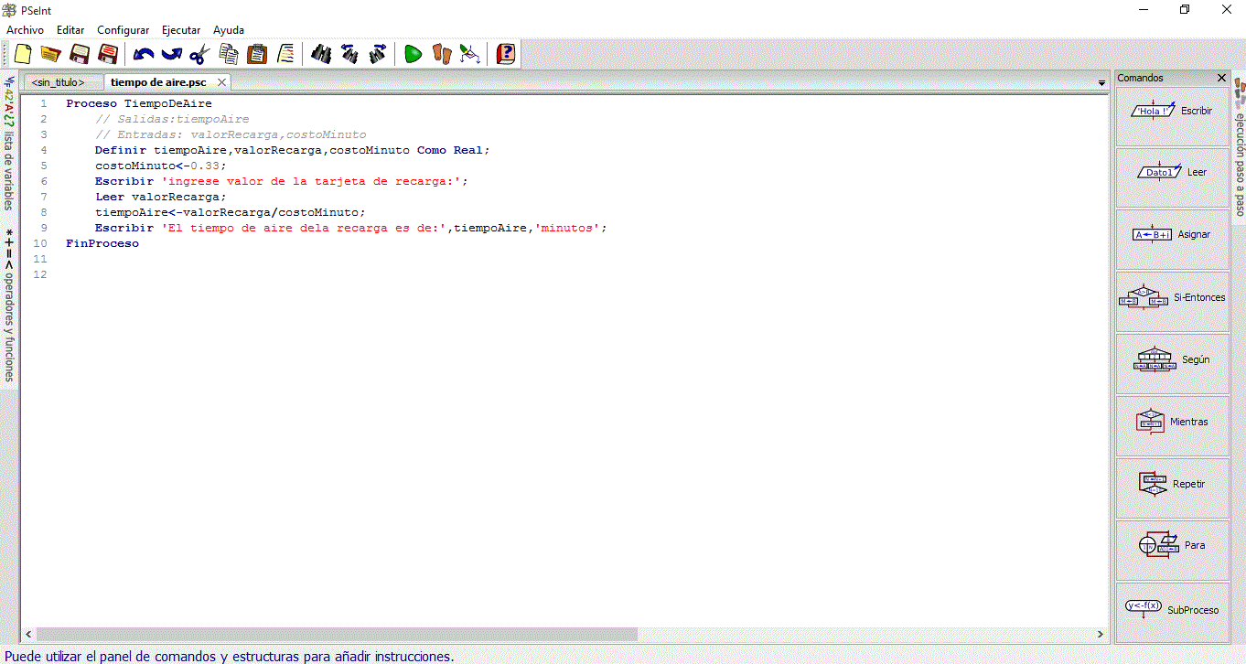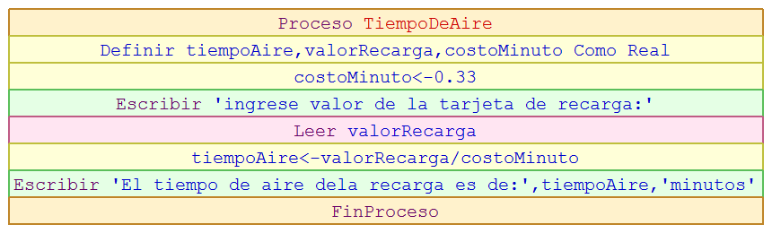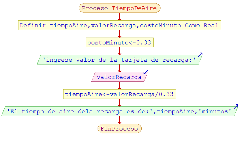 Escriba un algoritmo que permita determina el tiempo disponible (en minutos) que tiene un usuario al realizar una recarga de N valor. El costo por minuto de aire es de 0.33, ¿cuántos minutos tiene disponibles por una recarga de N valor?